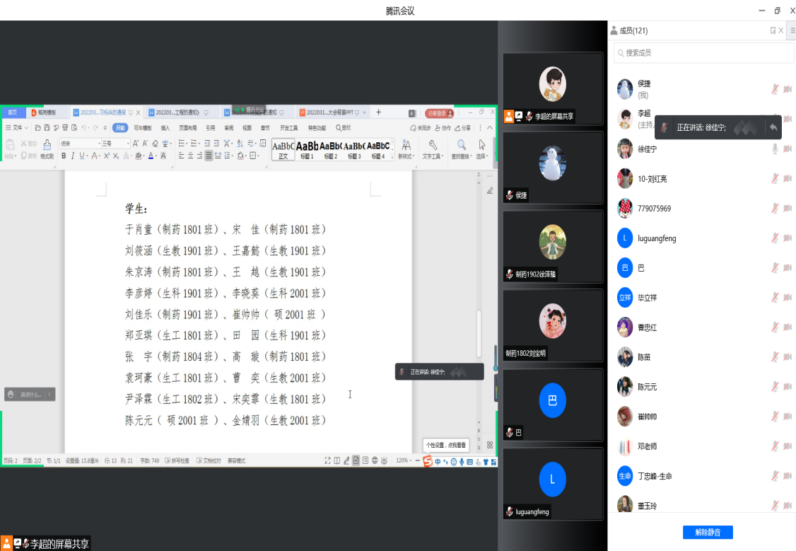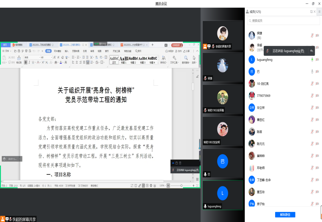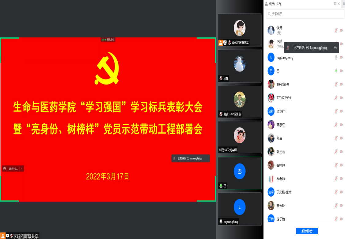 3月17日下午,生命与医药公司党总支利用腾讯会议召开“学习强国”学习标兵表彰大会暨“亮身份、树榜样”党员示范带动工程部署会,公司领导班子成员,各办公室(中心)工作人员,各党支部书记、委员,各系主任、秘书,全体党员以及受表彰人员参加会议。会议由副经理巴连良主持。