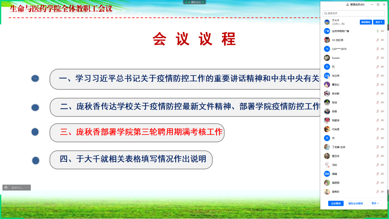 3月30日晚,betway西汉姆联利用腾讯会议系统召开全体教职工视频会议,传达学习疫情防控相关会议精神,部署公司第三轮岗位聘用期满考核工作。会议由党总支副书记陆广峰主持。