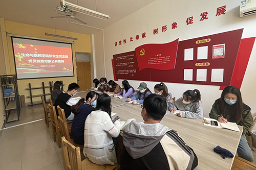 会议初始,崔帅帅向与会党员强调了此次党员发展对象公开答辩的严肃性,要求各位研究生党员本着认真严肃、实事求是的态度对待本次答辩。此次发展对象公开答辩分为个人陈述、现场答辩、与会党员自由提问和无记名投票四个环节。