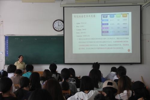 紧接着,高丽丽介绍了如何进行新冠肺炎的防治。她讲到,病毒感染多以预防为主,现阶段治疗药物有限,所以更多时候都进行主动免疫,即注射疫苗。她向同学们介绍了疫苗的发展和现阶段新冠疫苗的研发现状。随后。她强调要在日常生活中,同学们应戴好口罩,常消毒,及时通风,做好疫情防控。现阶段新冠肺炎药物研发正紧锣密鼓推进,各大高校及企业都在钩深索引,争取早日研发成功。我国始终坚持“动态清零”行动,坚持“早发现、早报告、早隔离、早治疗”,不断提升分区分级差异化精准防控水平。