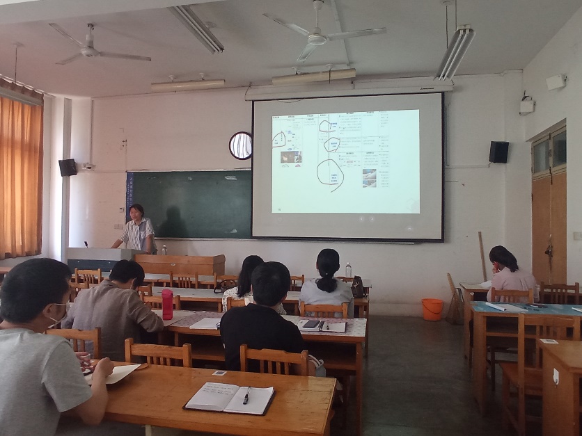 随后,秦洁老师做了《如何进行教学设计》的专题报告。她先从教学大纲课程目标设定、课程考核与评价方式及成绩比例设定等讲解了一门课的教学设计。她又结合自己参加课程思政教学比赛的经历,分别从教学内容与地位分析、学情分析、重难点分析、教学目标实现、教学资源选用、教学理念、教学方法、教学评价、教学组织过程、教学效果评价等方面详细展示了一堂课的教学设计,并提出了宝贵的意见和建议,帮助青年教师更好地设计课程教学。