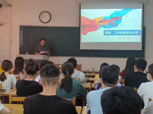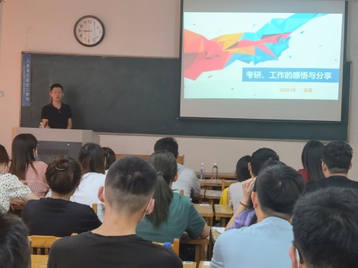 王宾针对每个人情况不同,从待遇、入职门槛、学习积累及资源人脉等四个方面与大家分享了考研与工作的关系。提出,考研过程是一个孤独和难熬的过程,但同时是一个努力、成长的过程,在这个过程中会有不一样的收获。此外,选择工作也是一种很好的历练,从自身及周围同事的例子来看,先就业可以先积累社会经验,在社会上可以学到公司学不到的东西,脱离了象牙塔的保护,会成长的更快,本科就业发展未必不如硕士生好。接下来,王宾与师弟师妹们分享了自己的工作感悟,指导大家如何选择就业方向,如何选择公司,与大家分享了编制与公司的利弊、大小公司的优劣;无论选择哪个方向就业,最重要的是自己的工作态度,自己要快速融入团队、了解企业文化,脚踏实地地自我学习、积累,对自己要有一个自我定位和规划。