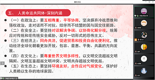 王畅从历史发展的角度简要回顾了中共八大到十七大的内容,随后王畅从十八大的会议议程、十八大主要精神、人民的期待、国内外媒体评价四部分带领同志们学习。会议还学习了中国特色外交理念和人类命运共同体等内容。