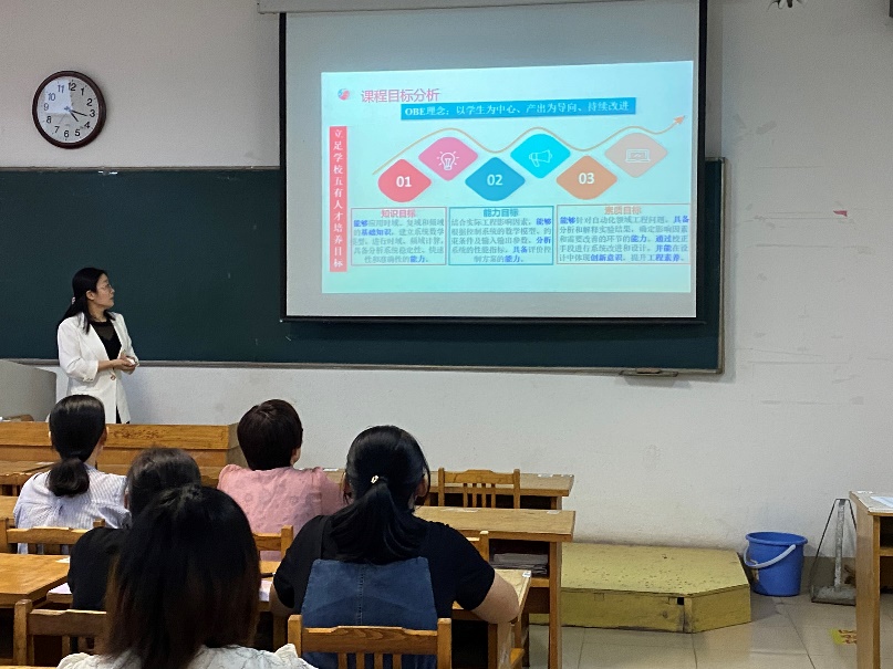 随后,刘老师依据《自动控制原理》课程,分别从课程基本信息、学情分析、课程分析、教学资源、教学过程分析、员工学习反馈评价分析、课程建设优势特色分析、课程设计反思等方面作了经验分享。刘老师强调教学内容要有深度、广度、温度及前沿性,并详细介绍了基于MOOC学习数据和BOPPPS有效教学结构的教学设计理念及实施。