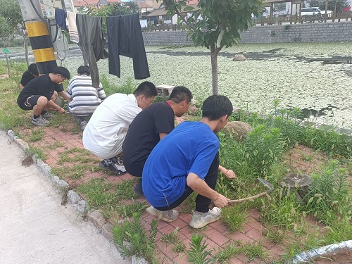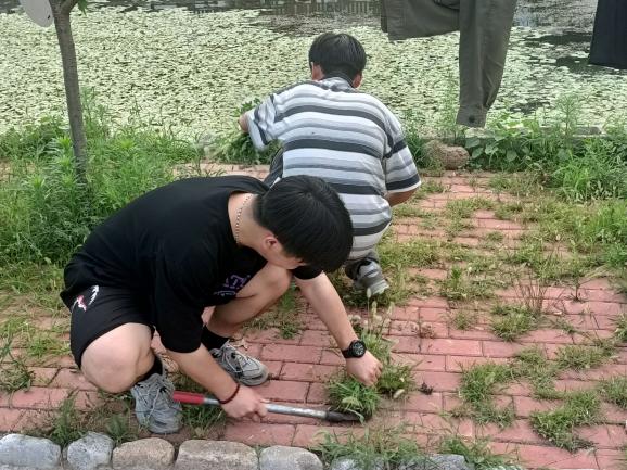7月14日清晨,实践团成员来到幸福大院外帮助村民拔除路边长势旺盛的杂草。在下小峰村村民们的热情指导下,实践团成员们很快便掌握了技巧,完成了任务。