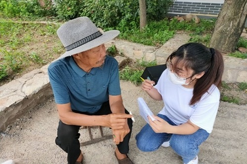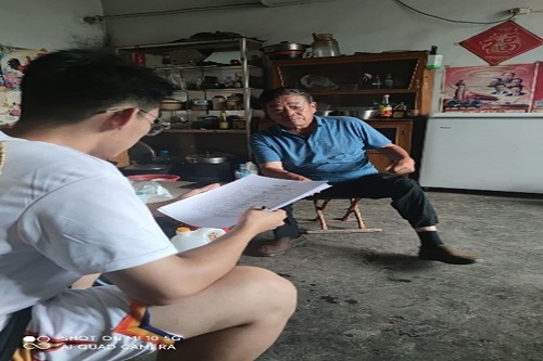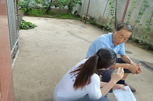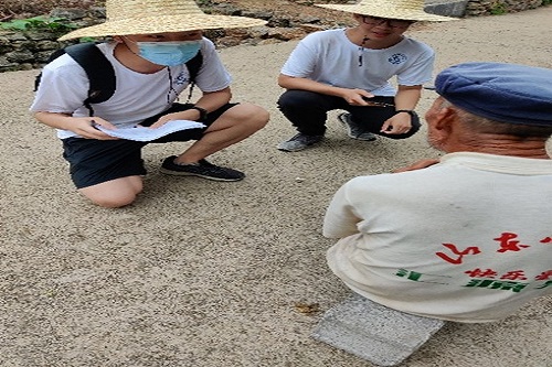 图为实践团成员向村里老人咨询本村基本状况