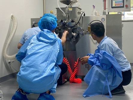 随后,生产人员带领团队成员来到杜仲籽油软胶囊生产的核心车间。向团队成员详细地介绍仪器的使用原理和使用方法以及杜仲籽油软胶囊制备的核心要点。在生产人员的指导下,团队成员一同进行讨论分析设备使用中容易出现的问题,以及如何避免这些问题。同时,针对杜仲籽油软胶囊的制作进行了试验,通过多次试验,团队成员发现杜仲籽油在制备过程中对温度、设备精密度等要求的苛刻,与标准的一丝差别就会导致制作失败。团队成员也意识到作为生产人员需要具备严谨的科研精神和为质量严格把控的负责态度。在团队成员和生产人员的反复试验下,终于成功制作出杜仲籽油软胶囊。