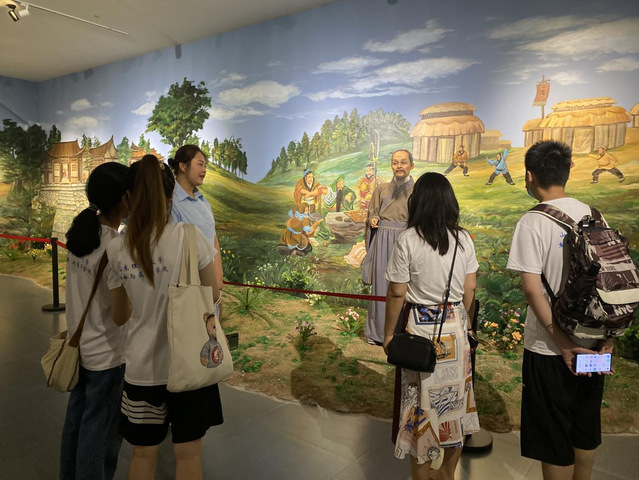 随后,团队成员跟随讲解员来到了位于名医蜡像馆旁的药膳馆。药膳馆内陈列着八大菜系、药膳常用中草药以及药膳。在中草药展示台上,团队成员注意到带有地域特色的中药,例如淄博全蝎、潍坊山楂核、泰安灵芝等。在药膳台上,陈列着各式针对不同症状的药膳。带队老师指导团队成员着重学习淄博当地的中草药,丰富中医药知识储备,为后期宣传夯实基础。