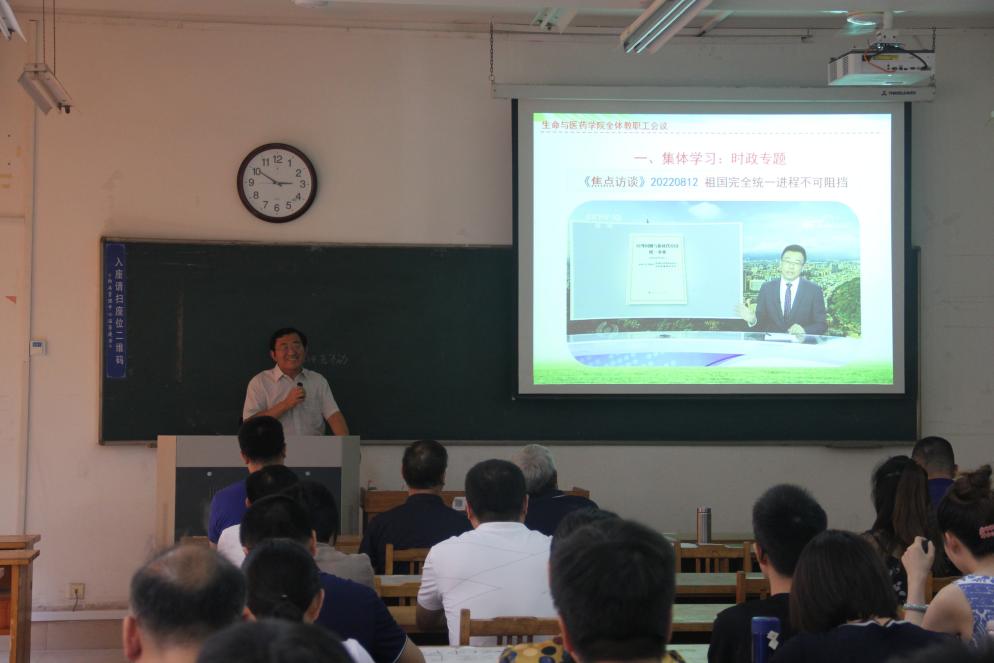 与会教职工还集体观看了中央电视台《焦点访谈》8月12日专题节目“祖国完全统一进程不可阻挡”视频资料,作为时政专题教育内容,使大家进一步加深了对当前台海局势以及党和国家维护祖国完全统一的坚定决心和坚强保障的认识。