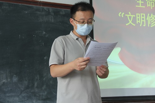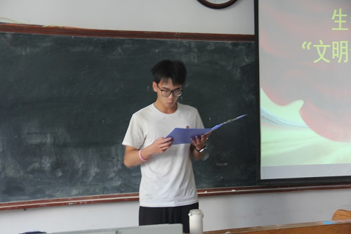 接下来,生工2101班长周安阳作为班级代表发言。他介绍了生工2101班文明修身活动的相关经验,号召全体同学崇德修身,做文明风尚的传播者;共创共享,做文明校园的建设者;以身作则,做文明修身的建设者。