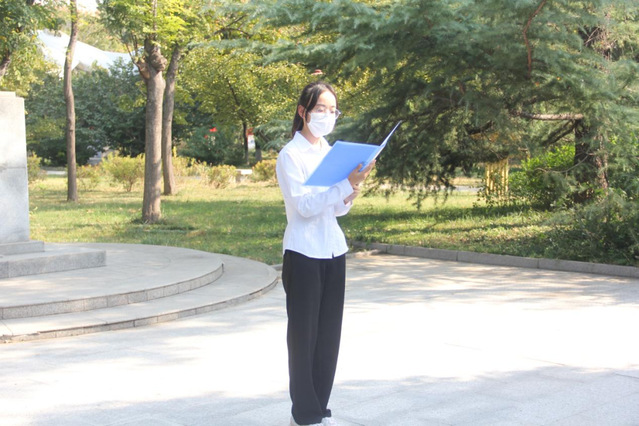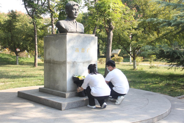 随后,全体党员肃立,为英勇献身的冯思广烈士默哀。默哀毕,党员代表田园、李龙琪敬献鲜花。