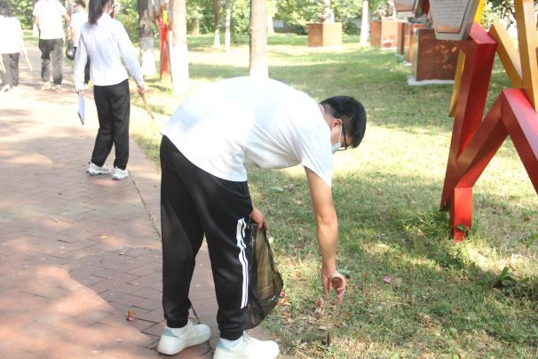 最后,全体党员开展志愿服务活动——打扫国防教育主题园。