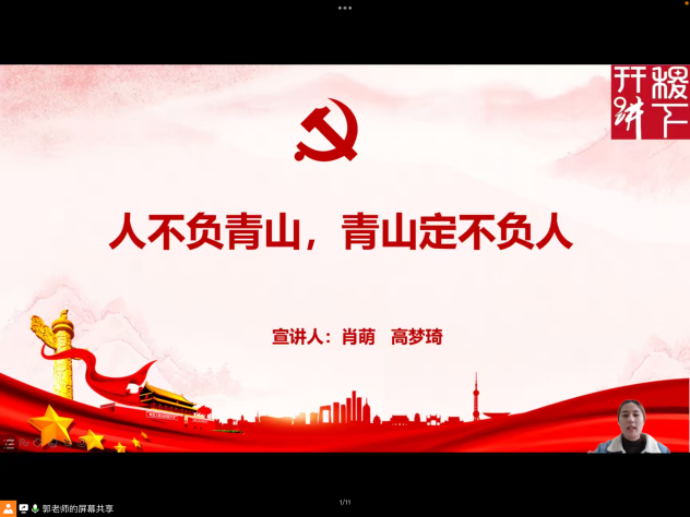 肖萌和高梦琦以“人不负青山,青山定不负人”为题,结合党的二十大报告中关于生态文明建设的重要论述,从“生态环境—环境在变化”“生态环境—国家在行动”“生态环境—榜样在行动”“生态环境—我们要行动”等4个方面,系统讲解了我国生态环境的现状及存在的主要问题,近年来国家为加快推进生态文明建设战略部署出台的一系列政策和措施,在生态环境保护方面做出重要成绩的先进人物及其典型事迹,倡导青年学子要从垃圾分类、节约水电、光盘行动等身边小事做起,积极践行生态文明理念。