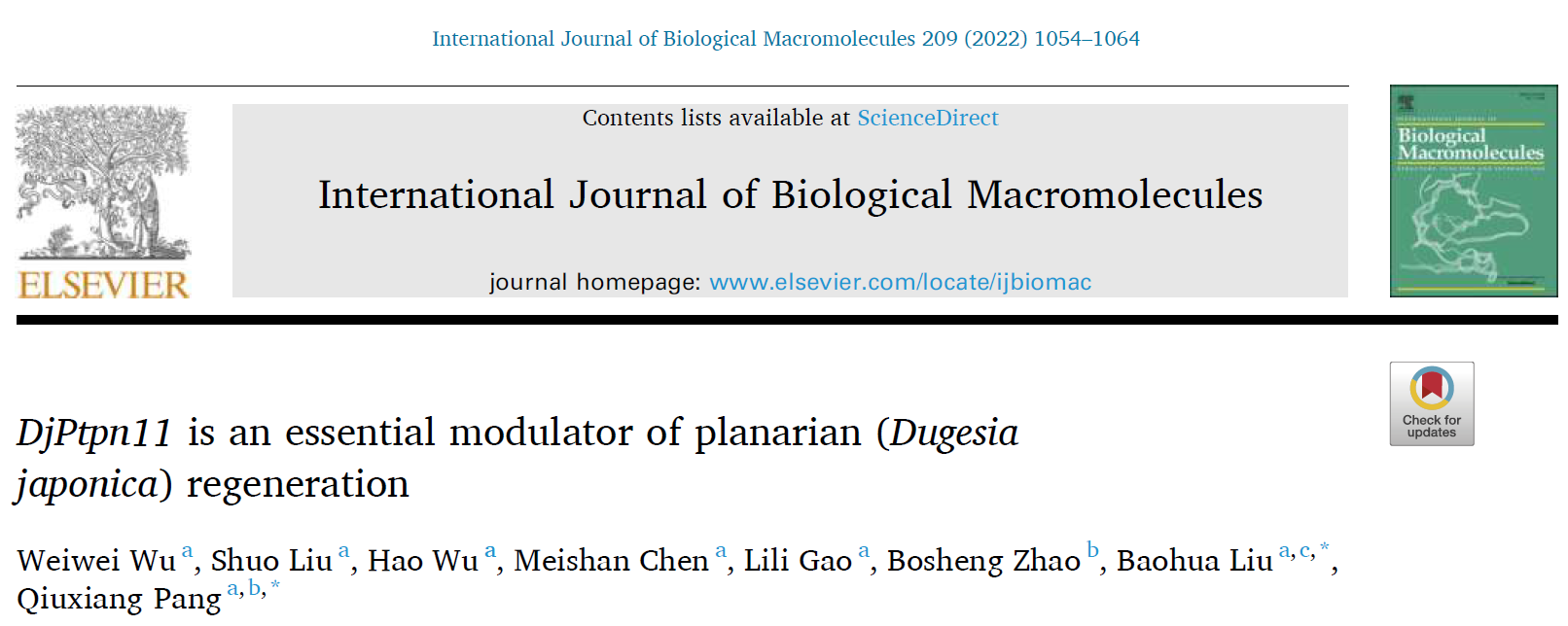 近日,公司抗衰老与再生医学研究所的免疫与再生研究团队青年教师吴韦韦老师首位在涡虫再生机制方面取得重要进展,相关成果以“DjPtpn11 is an essential modulator of planarian (Dugesia japonica) regeneration.”为题发表在International Journal of Biological Macromolecules IF8.025)杂志上。