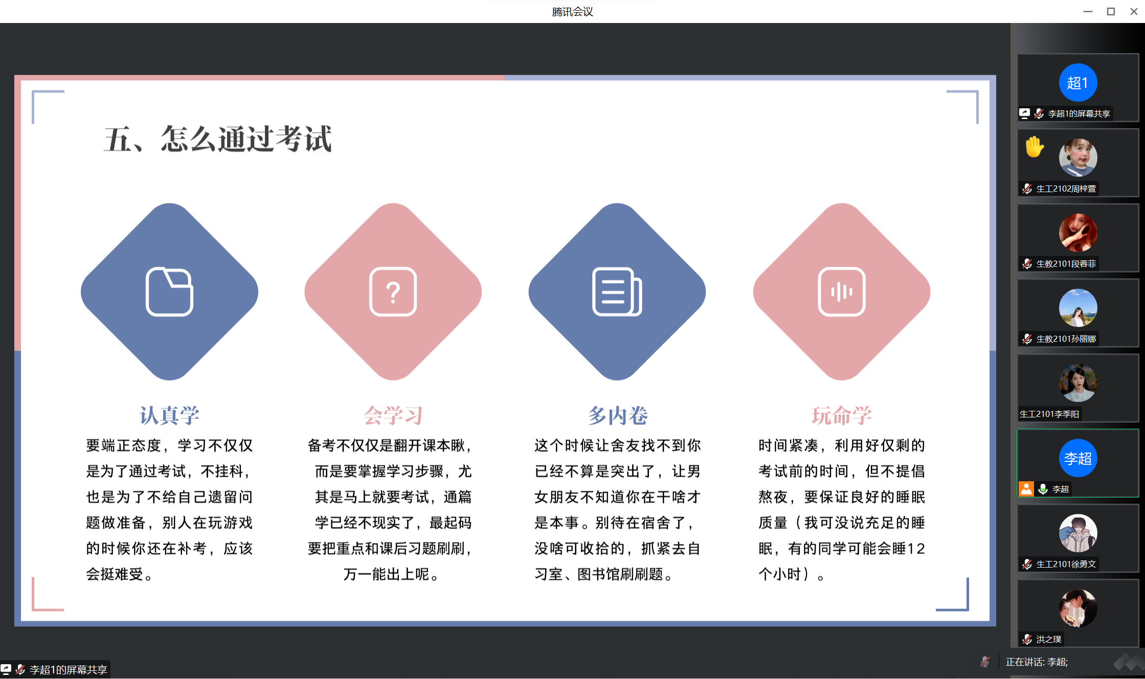 随后,他对于“怎么通过考试”、“坐着考试,不是‘作着’考试”作了重要阐述,让大家明晰相关管理规定,杜绝考试作弊,诚信考试,诚信做人。