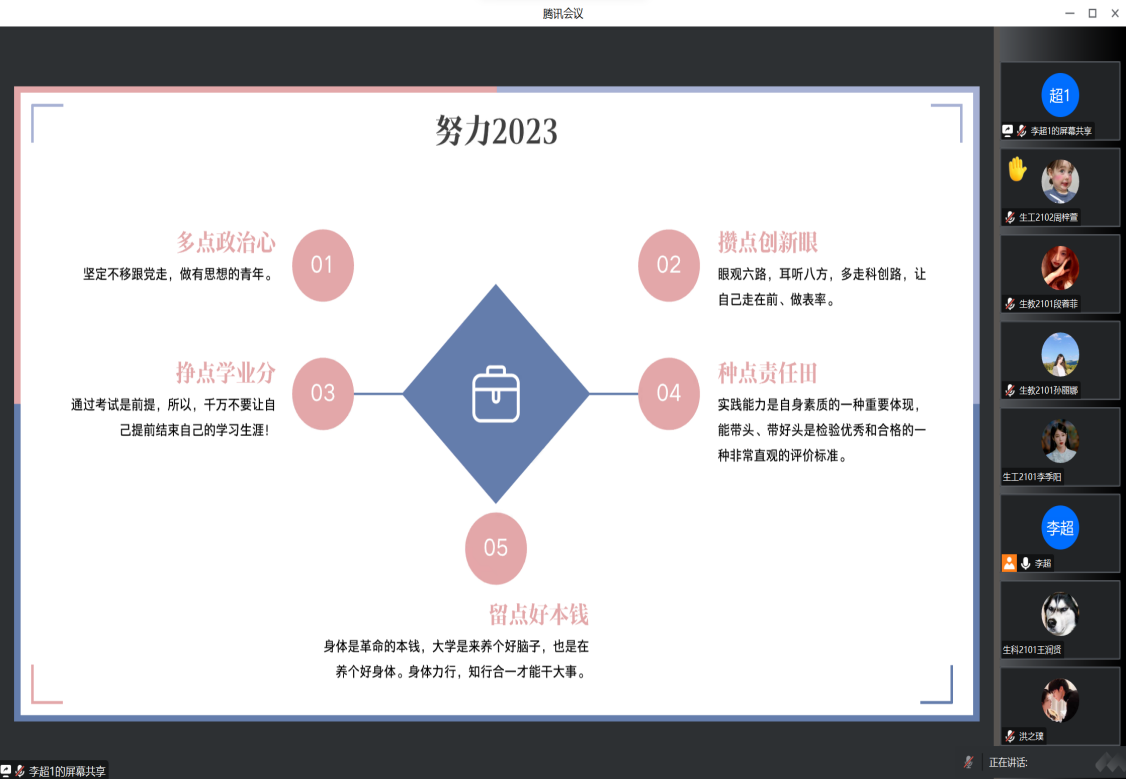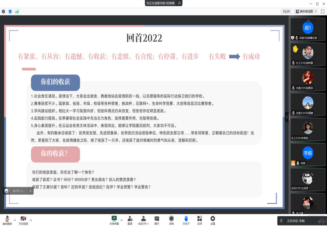 会上,李超首先回首了2022,从社会责任涌现、赛事获奖不少、学风建设趋好、实践能力提高、身心素质提升等方面总结了2022年同学们的收获,在疫情爆发之际,除了收获了一只“羊”,还收获了面对艰难时的勇气和从容,坚毅和忍耐。他期待同学们从5个方面努力2023,希望大家多点政治心、攒点创新眼、挣点学业分、种点责任田、留点好本钱。