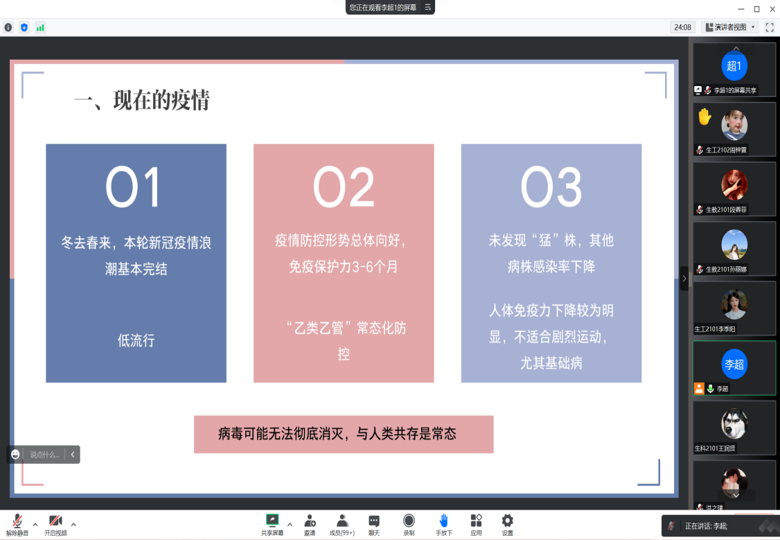 李超对新学期重要事项进行了强调。他着重从“现在的疫情”、“还抗疫吗”、“防疫,还得防‘疫’外”、“学习学习学习”等4个方面,呼吁每位同学要坚持防疫不松懈、保护安全不松懈、夯实学习不松懈,倡导每位同学要养成良好生活学习习惯,树立明确目标,努力奋斗。