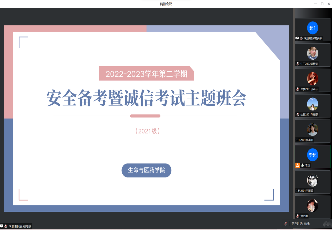 2月18日晚,betway西汉姆联利用腾讯会议召开2021级2022-2023学年第二学期安全备考暨诚信考试主题班会。公司2021级各班班主任、全体员工参加会议,会议由辅导员李超主持。