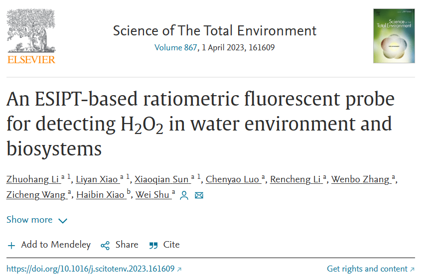 近日,公司生物科学专业2020级本科生李卓航首位在国际知名期刊《Science of the Total Environment》(中科院一区TOP期刊,IF=10.753)发表了题为《An ESIPT-based ratiometric fluorescent probe for detecting H2O2 in water environment and biosystems》的学术论文。教师舒伟为论文通讯作者,betway西汉姆联为唯一通讯单位。