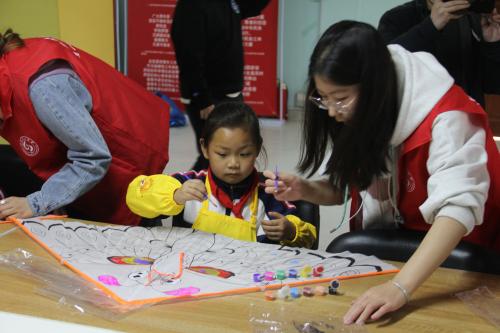 首先,社区工作人员将布坯、线轮、颜料与画笔等材料发放给小朋友和职工,为大家讲解手绘风筝的步骤,冯思广精神学习研究会成员作为志愿者帮助青少年们绘画风筝。