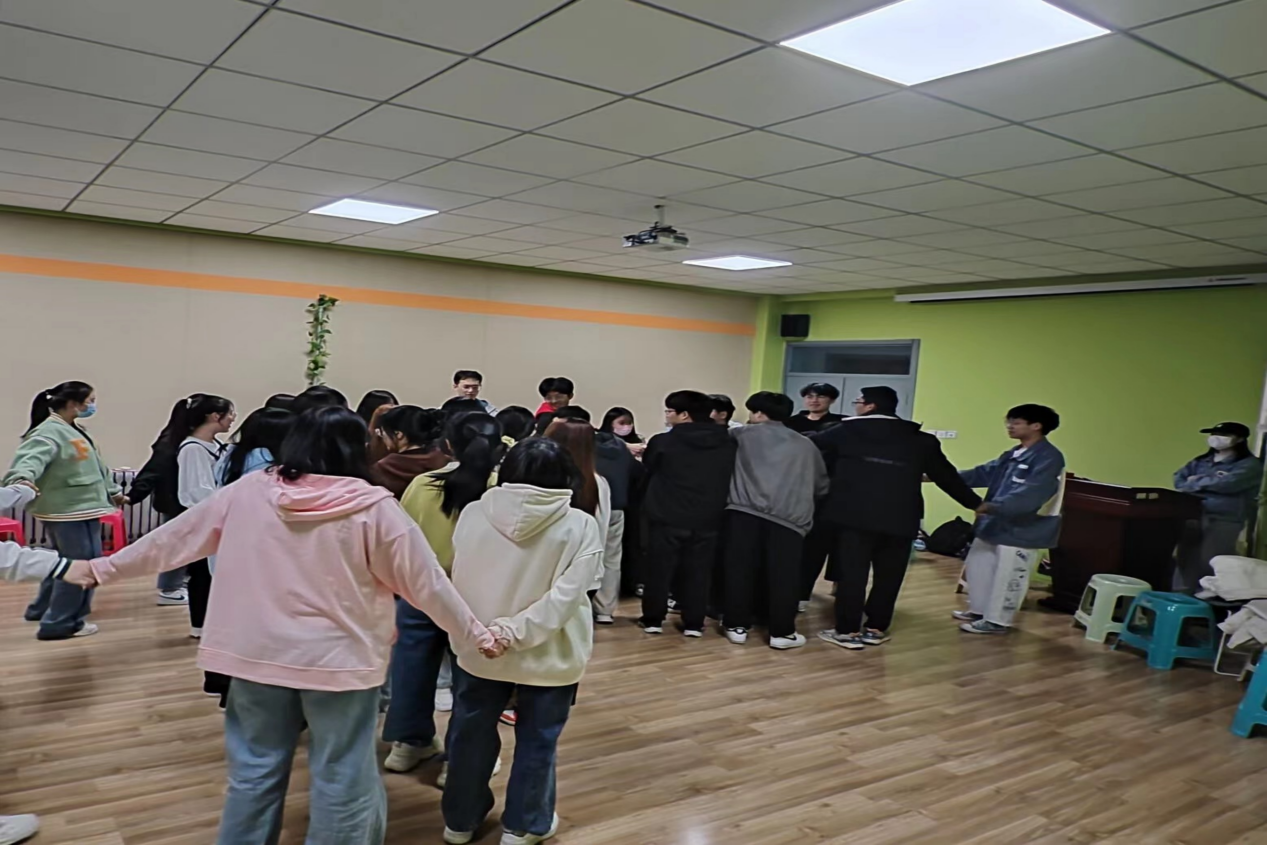 接着是地图板块,情有千千结。游戏起初选择了一位淄博本地的同学站到场地的中间,作为地图板块的中间。随后其他同学根据地图中的历史方位站到这位同学相应的位置,例如生活在在淄博北部的同学站在这位同学北边,来自相同城市的同学站在一起,以此类推。最终所有同学按照地域组成了一幅地图。紧接着每位同学们各自和身边的同学手牵手,在不松手的前提下,尝试着恢复成了一个大圆圈。在游戏互动中,制药2204班全体同学展现了令心理辅导员都赞叹的合作能力,同学们默契有序,不抢不乱,在短短几分钟之内将复杂的“地图”解成了一个大圆圈,甚至打破了这个游戏的耗时记录!