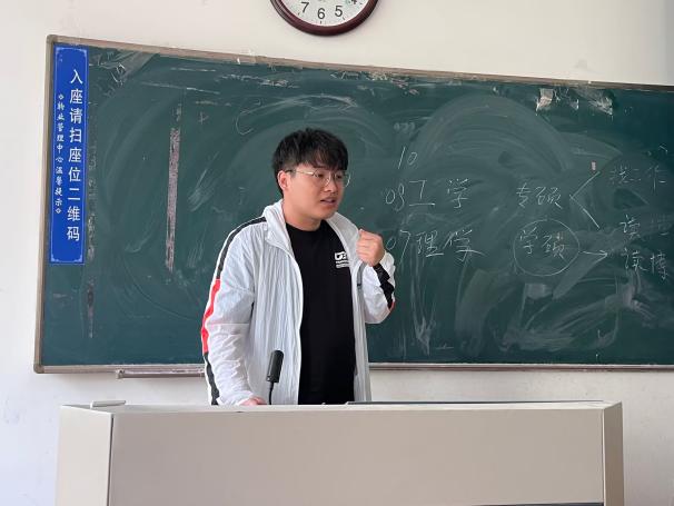 随后,考研优秀代表就考研上岸经验分别向同学们分享。马超沅,成功上岸大连理工大学,分享了高数学习经验,强调多刷题的重要性。高蒙蒙,考研429分,详细介绍了考研英语的备考重点,从单词、语法、阅读、作文等方面分享了学习技巧。陈海洋,高分上岸本校,着重介绍了学习方法,如记忆曲线法和思维导图法,强调了心态在备考及考试过程中的重要性,他强调考研要有破釜沉舟的决心和承担好坏结果的勇气。祝新宇,成功调剂到中国药科大学,她主要分享了自己关于调剂方面的经验。