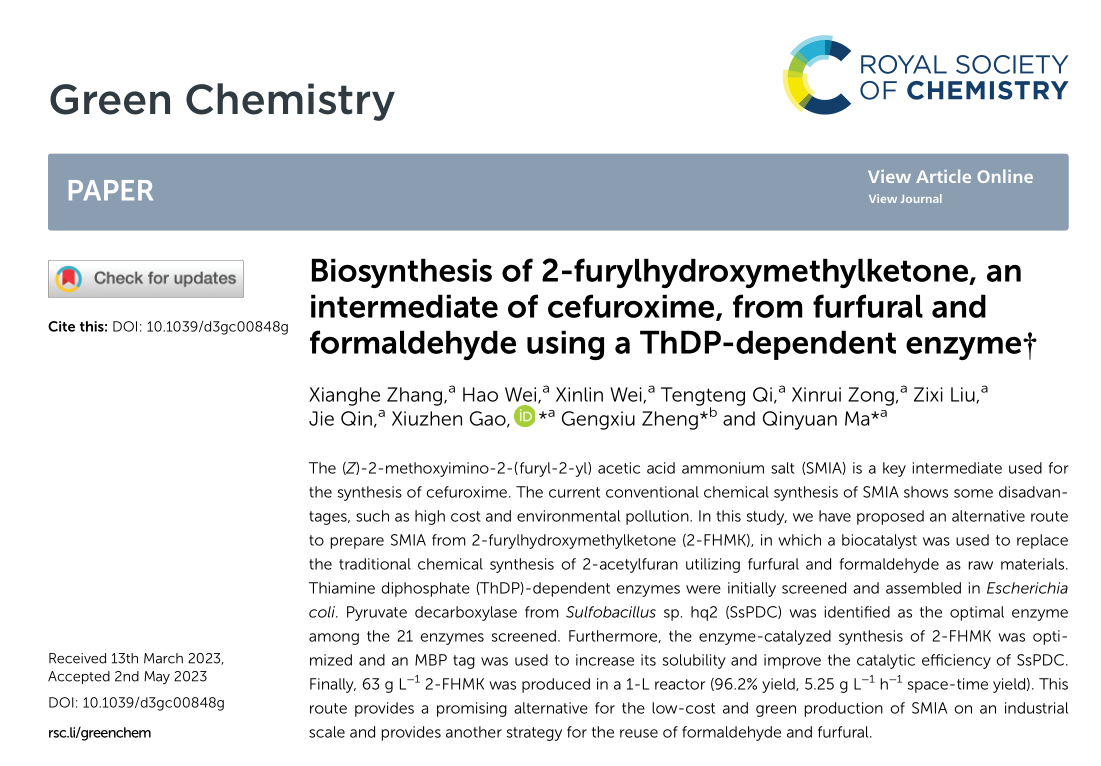 近日,公司betway西汉姆联马钦元/高秀珍团队在生物催化合成头孢呋辛关键中间体方面取得了重要进展,相关成果以“ Biosynthesis of 2-furylhydroxymethylketone, an intermediate of cefuroxime, from furfural and formaldehyde using a ThDP-dependent enzyme”为题发表在本领域顶刊Green Chemistry(IF:11.034)。文章首次实现了头孢呋辛关键中间体的高效生物合成。