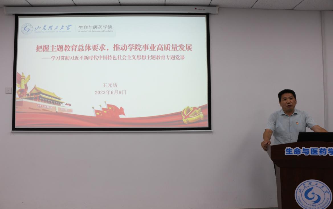 6月9日上午,公司党委书记王光坊在13号教学楼215室以《把握主题教育总体要求,推动公司事业高质量发展》为题为公司师生党员讲党课,集团督导组成员张开旺现场指导。