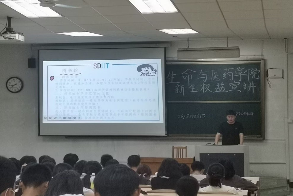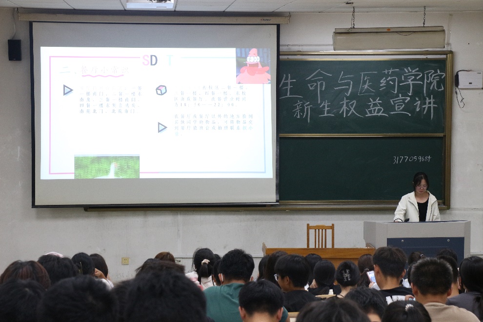 首先宣讲人简介院权益部的宗旨、主要职责,并从学习篇、生活篇、安全篇三个方面讲述权益是什么,如何独立自主学习生活,自己在校有哪些合法权益,怎样合法维护自己的权益。他们介绍到东西校区的教学楼、实验室的具体位置,并着重强调了自习室的使用和安排。他们讲到图书馆的预约与使用、校园卡的充值与挂失、就餐过程遇饮食问题解决途径、洗衣机的使用、宿舍注意事项、校园网使用,以及故障检测报修等一系列实际问题,为同学们提供切实有效的方法和途径,更好的适应公司生活。