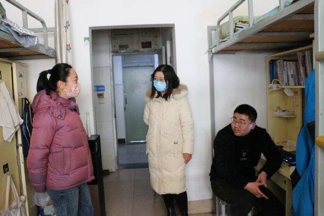 2月29日,全体辅导员在党委副书记姜素琼带领下,挨个走访员工公寓楼,检查宿舍卫生大扫除情况,深入宿舍排查违章电器、电动车充电、劣质插排和饮水机等不合格电器,处置化解消防安全隐患。与同学们亲切交流返校后身心感受、新学期规划安排等事宜,提醒同学们多开窗通风,合理利用宿舍空间规置个人物品,不断改善宿舍环境。走访中还着重对本科毕业生考研、就业等情况进行了跟进,听取了部分毕业生的问题困惑与诉求,并有针对性地进行了现场答疑指导。