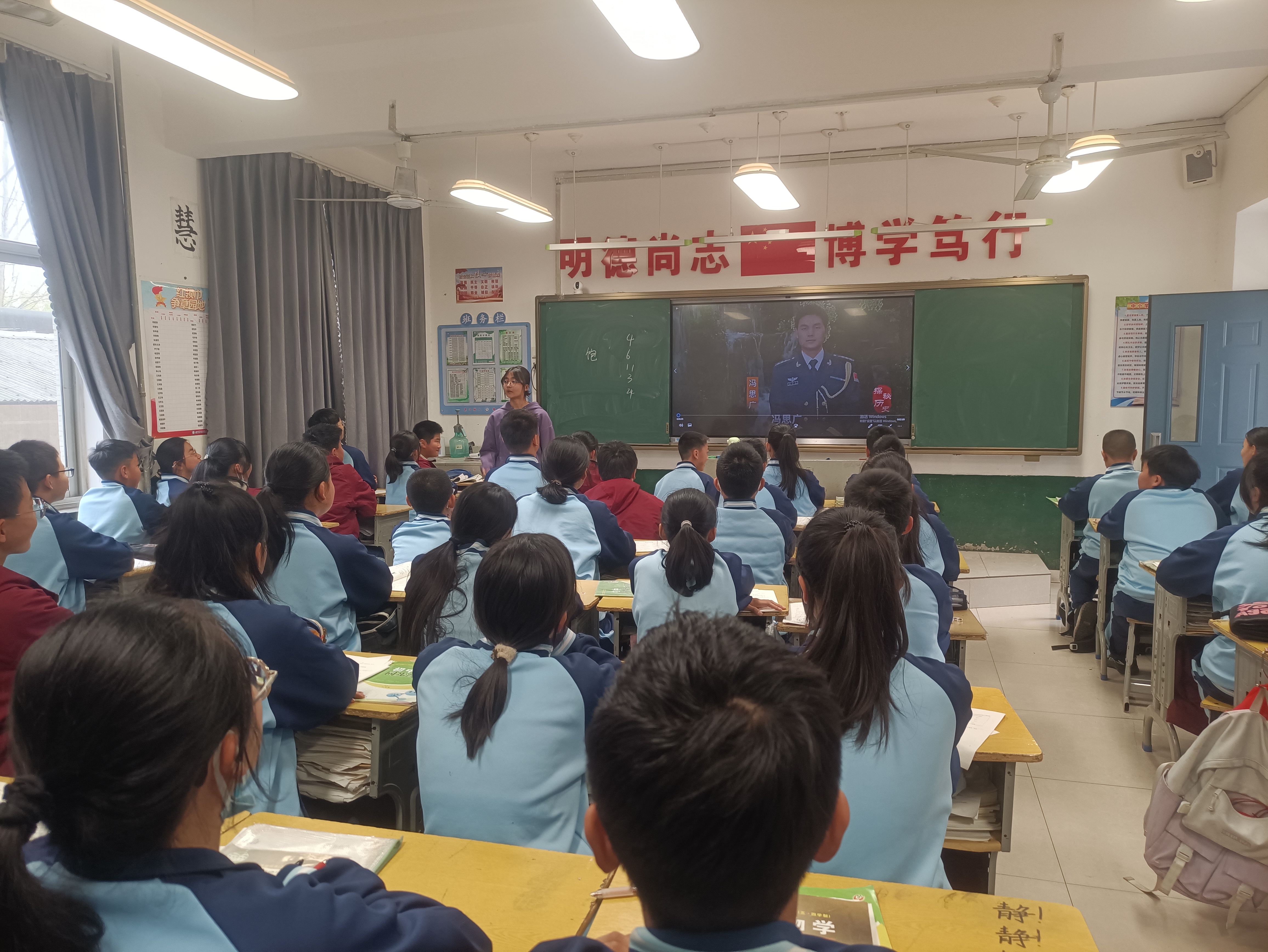 4月3日,第三届“冯思广班”于美琪、董淑钰在实习公司张店区第六中学召开主题班会宣讲冯思广精神,为初一三班的员工上了一堂生动的思政教育课。