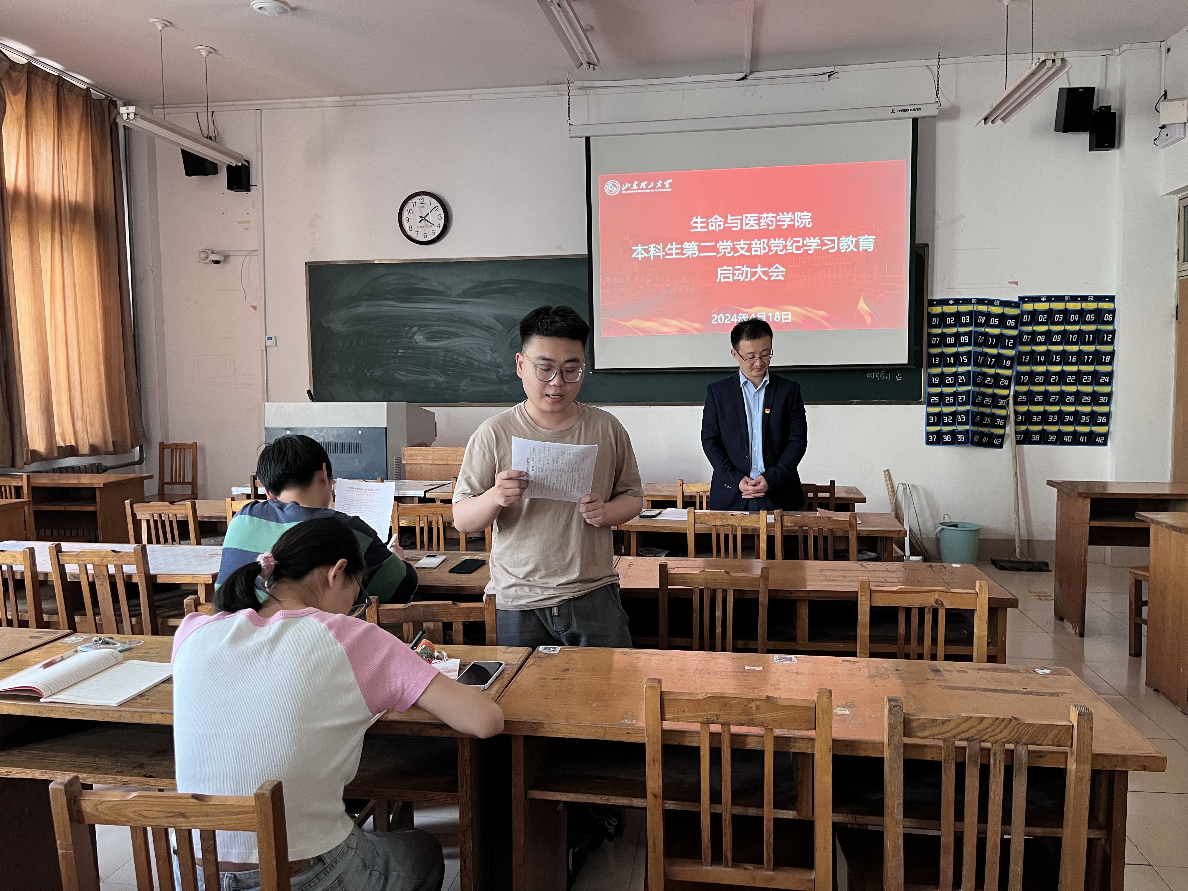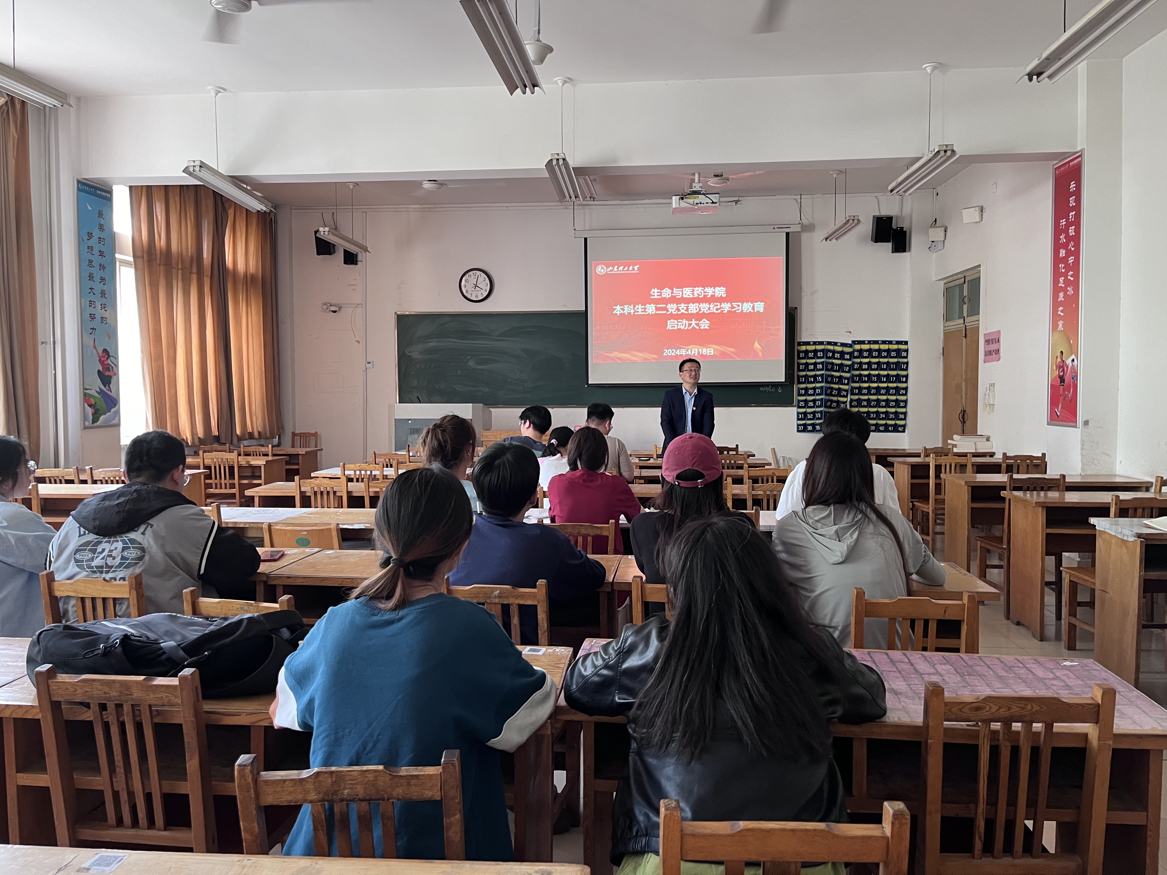 4月18日下午,公司本科生第二党支部在13号教学楼201室召开全体党员大会,传达学习公司党委理论学习中心组集体学习暨党委(扩大)会议精神,遵照公司、公司党委关于开展党纪学习教育工作部署要求,启动支部党纪学习教育工作,全体党员参加会议,会议由支部书记翟静涛同志主持。