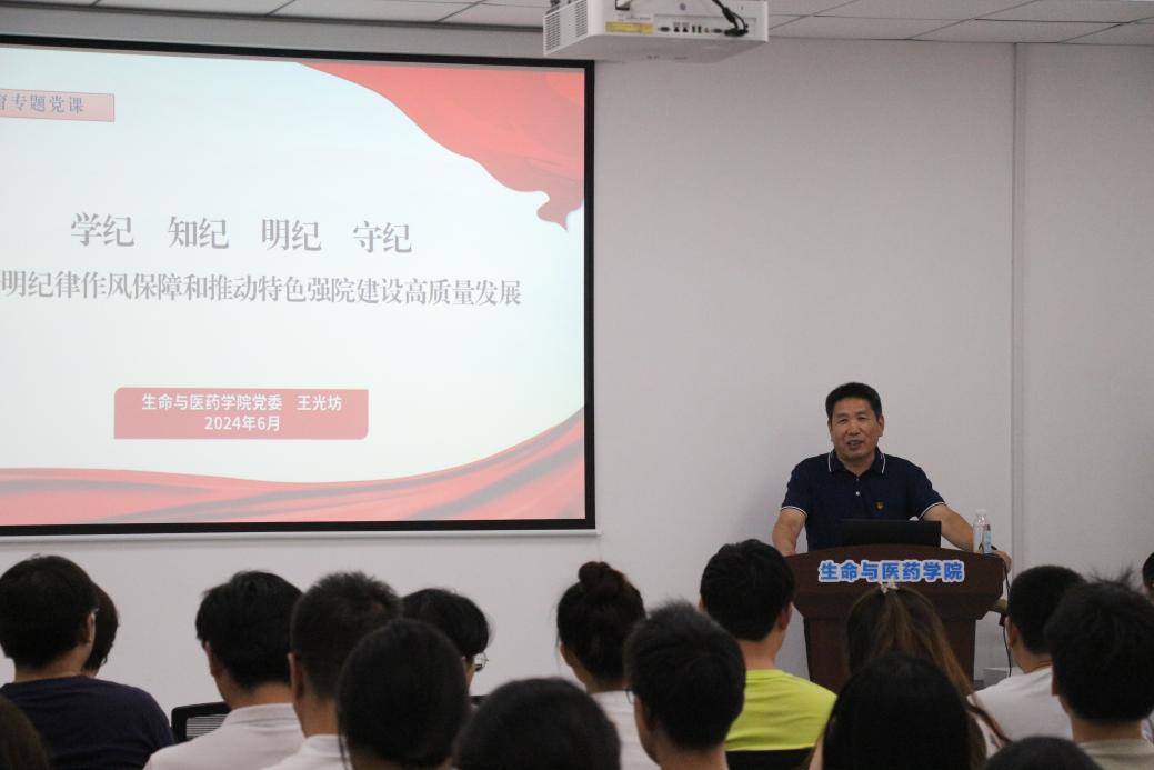 表彰活动结束后,党委书记王光坊同志为全体师生党员讲授题为《学纪 知纪 明纪 守纪,以严明纪律作风保障和推动特色强院建设高质量发展》党纪学习教育专题党课。“军队向前进,生产长一寸,加强纪律性,革命无不胜。”王光坊以伟大领袖毛泽东在西柏坡给东北野战军负责人和各中央局、各前委负责同志所发电报中的内容深刻阐明了,组织严密、纪律严明是我们党的优良传统和政治优势。他指出,原原本本学习新修订的《中国共产党纪律处分条例》是本次党纪学习教育的重点,专题党课重点围绕“深刻认识修订《条例》的重要意义”、“《条例》的主要内容及修订的亮点解读”、“抓好《条例》的贯彻落实,推动公司高质量发展”等三个方面展开。他强调,党的十八大以来,习近平总书记在推进全面从严治党中高度重视纪律建设,强调加强纪律建设是全面从严治党的治本之策,纪律不严,从严治党无从谈起。要扎实开展党性党风党纪教育,每一名党员特别是领导干部都要牢固树立党章意识,要时刻用党章党规约束自己的言行。随后,他以实例分析、案例警示重点解读了《条例》修订中的8个亮点,围绕如何抓好贯彻落实,推动公司事业高质量发展,他向全体党员同志提出了3点希望与要求,一是要端正态度,提高认识,原原本本学习领会《条例》精神。二是要内化于心、外化于行,把守纪律讲规矩内化为行动自觉。三是要以学正风,学用结合,以新的作风推动特色强院建设高质量发展。要通过党纪学习教育,进一步提振师生信心,凝聚发展力量,以公司“十四五”发展目标为牵引,全力推进博士点建设工作,扎实做好高层次人才队伍建设、人才培养、专业认证、团队建设和科研工作、校地校企合作等工作,以高质量党建引领公司事业高质量发展,推动特色强院建设不断迈上新台阶,以实际行动和优异成绩迎接中国共产党成立103周年。