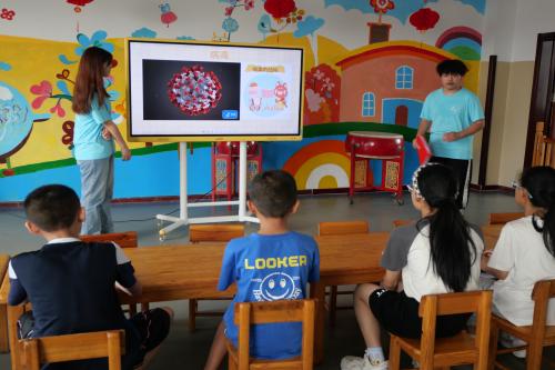 接着,七月蜜蜂实践团周长旭向孩子们做了关于青少年自救自护安全方面的宣讲,宣讲内容与学科教学有紧密联系,着重介绍了生活中在夏季比较常见的可能对身体有危害的生物,如隐翅虫、蚊子等昆虫。