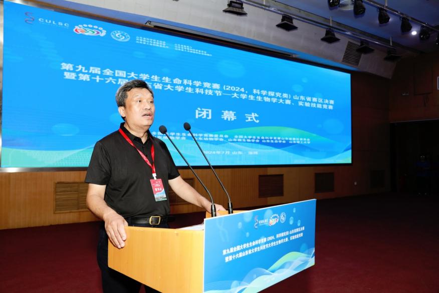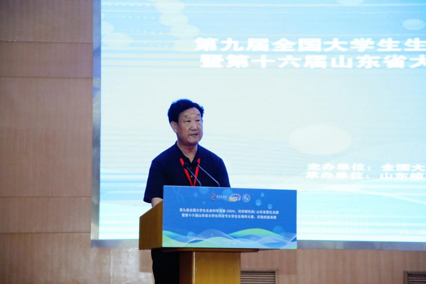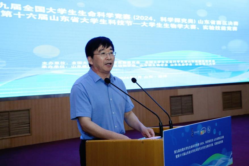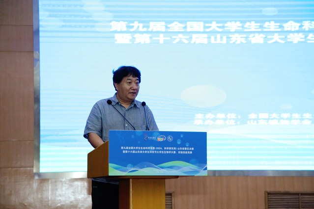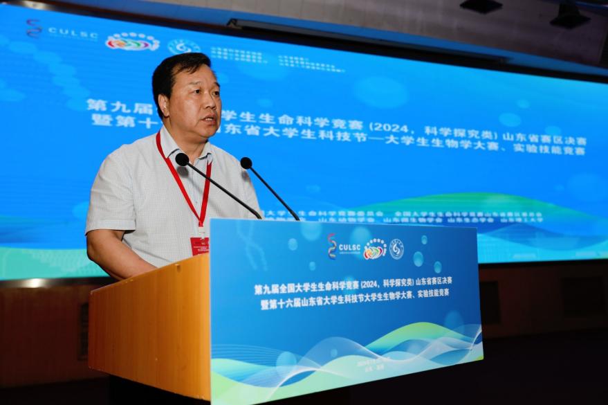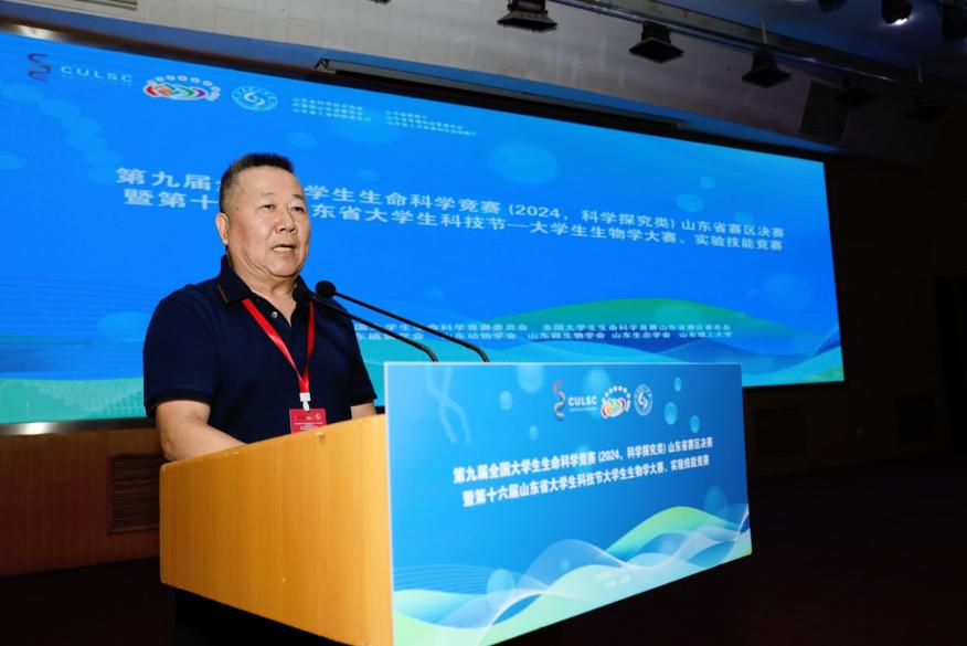郭善利教授代表竞赛山东赛区组委会向全国老员工生命科学竞赛委员会、山东省各赛事指导上级单位部门和公司表示感谢,热情欢迎来自全国各地的专家教授、评委老师和全省各高校的参赛师生。