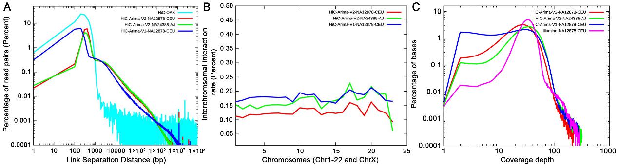 Hi-C技术已经被广泛应用于基因组的scaffolding,通过使用不同的算法在染色体水平上组装基因组。相比之下,各种Linked Reads技术已被证明在提升基因组组装过程中short reads的价值方面具有显著优势。为此,文章提出了一些量化指标用于评估不同long-range技术平台的测序数据质量。研究结果表明,Hi-C Arima Genomics V2平台产生的数据质量明显优于V1平台 (图2)。每种技术都有其独特的特点,研究人员可以根据本文提出的评估方法来选择最适合的技术。总体而言,Hi-C和Linked Reads技术能够显著提高基因组组装质量,增强结构变异(SV)的检测精度。随着NGS技术和相关软件流程的进一步发展,long-range技术必将继续壮大。