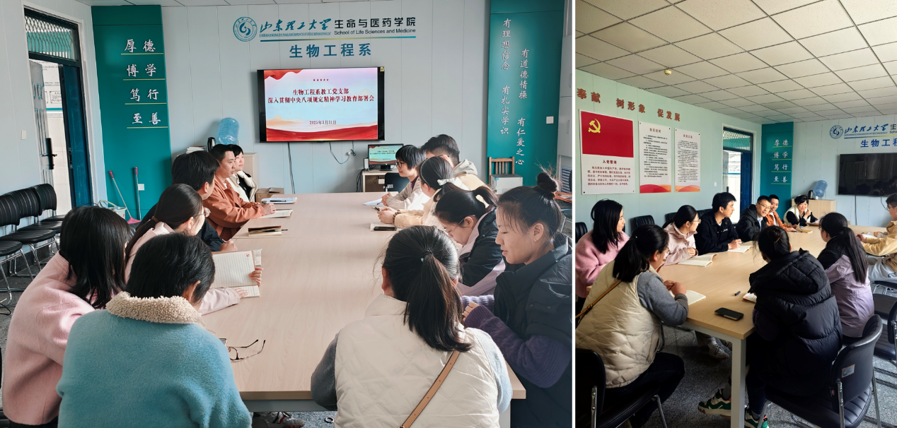 为深入贯彻落实中央八项规定精神,进一步强化作风建设,3月31日上午,生物工程系教工党支部在13号教学楼359会议室召开深入贯彻中央八项规定精神学习教育部署会,全面部署支部学习任务,制定学习计划并落实责任。会议由党支部书记赵延芳同志主持,支部全体党员参加。