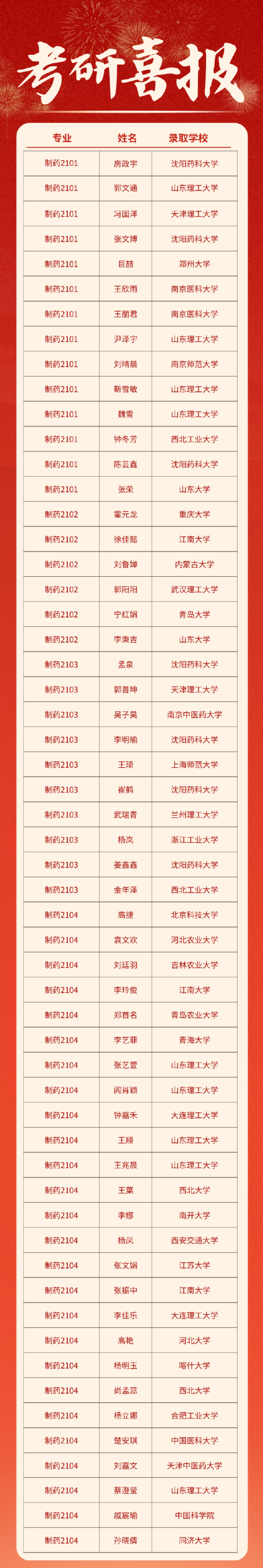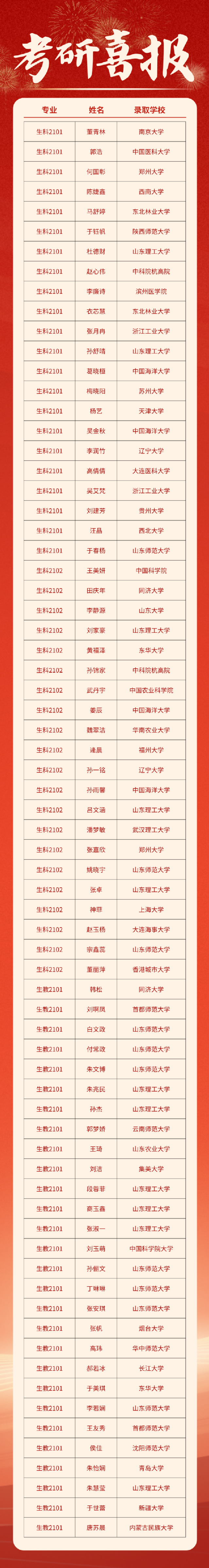 317名毕业生中共有159人被国内外知名院所录取,考研录取率达50.16%,实现新跃升,创公司历史新高,其中77名同学被中国科学技术大学、中国科公司大学、同济大学、南开大学、西安交通大学、山东大学、西北工业大学、大连理工大学等“双一流”高校录取,占比48.1%。公司第三届“冯思广班”、生教2101班考研录取率达68.3%,在9个毕业班级中位居第一;23号公寓1027、1029、1129三个女生宿舍全员“上岸”,“研”值爆表。