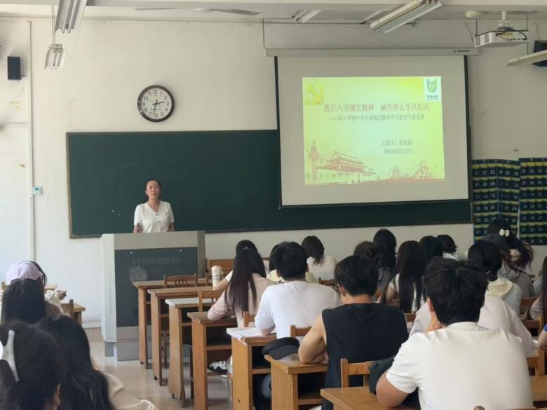 612日,公司青廉课堂顺利开讲,公司党委书记纪委书记姜素琼以“践行八项规定精神,涵养清正学风院风”为题13201室为员工党员讲授深入贯彻中央八项规定精神学习教育专题党课,公司本科生第一、第二党支部全体党员参加。