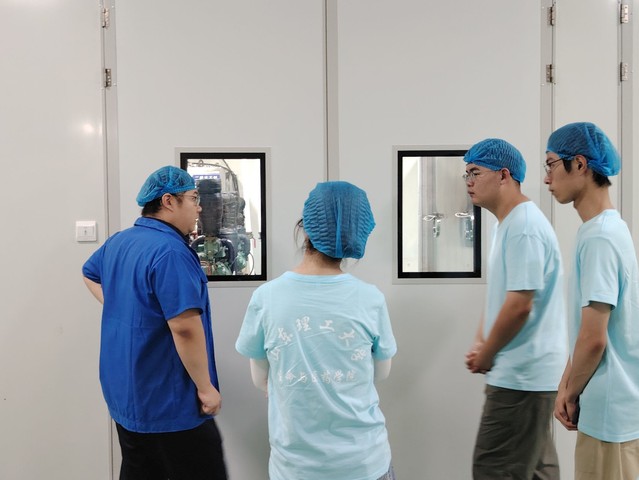 参观完公司文化展厅后,“益生军”实践团成员在专业技术人员的陪同下,走进了益生菌生产车间。通过近距离接触生产现场、直观观察工业化生产全流程,成员们对益生菌生产有了更为全面且深刻的认知,为后续的菌株采集工作筑牢了实践根基。在车间内,技术人员详细介绍了益生菌菌株从发酵、提取、包被到冻干、粉碎的完整生产销售链条。实践团成员深入各条生产线,逐一观摩了每个环节的具体操作,对益生菌的工业化生产有了更真切的体验。