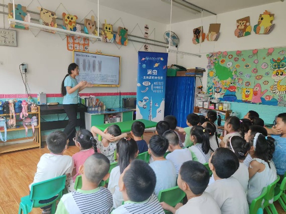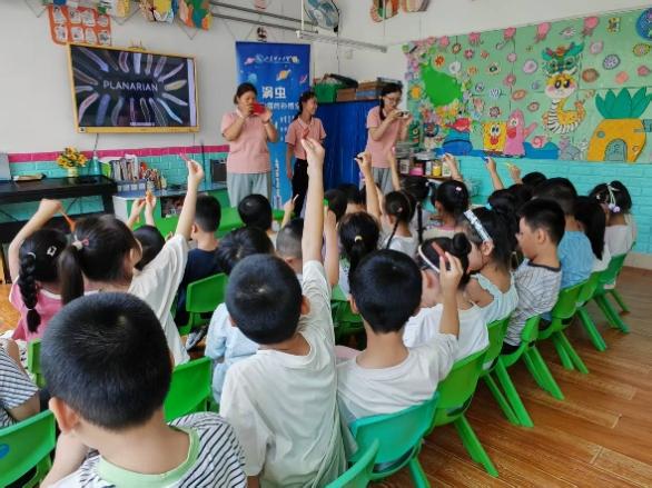 一边看着培养瓶中的实物,一边听着实践团成员的生动讲解,小朋友个个全神贯注,尤其观看了小涡虫从一小段逐渐长成一个完整个体的视频后,小朋友们难掩激动,纷纷投来惊讶、羡慕的眼光。不时有小朋友举手提问,实践团成员均耐心地一一解答。
