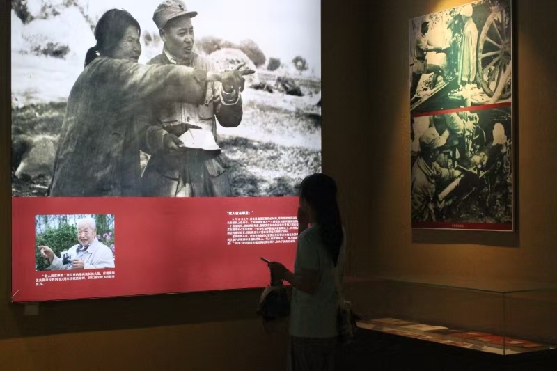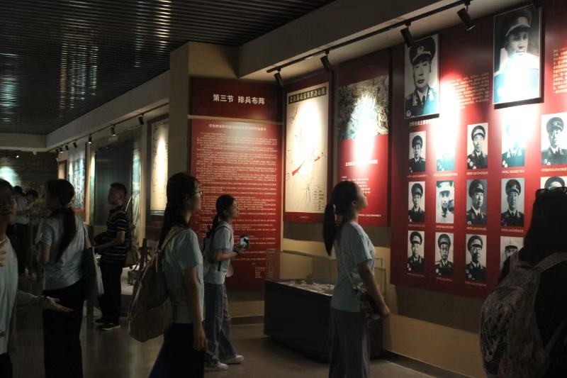 在纪念馆展厅内,实践团成员们驻足于毛主席遒劲的手书笔迹前,凝望展墙上共产党将领陈毅、粟裕与国民党将领张灵甫等的对比影像,深刻体悟战略智慧与革命信念交织之中所迸发的磅礴力量。同时,团队成员们也止步于新华社战地记者邹健东拍摄的经典照片——一位农村大娘正冒着炮火为炮兵连长指示敌军指挥所方位。正是这样的“战场之眼”,让解放军在陌生山区精准锁定目标。这些珍贵的历史瞬间,让成员们更加深刻地认识到军民一心、众志成城的力量。