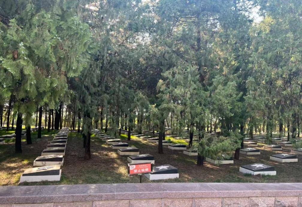 心中激荡着对革命先烈们的无限崇敬,实践团成员随后移步至纪念馆后方的孟良崮革命烈士陵园。苍松翠柏掩映之下,花岗岩墓碑庄重肃立,安葬着数千名为国捐躯的英烈。成员们列队肃立,向长眠于此的英雄们默哀致敬并敬献白菊。墓碑上镌刻的姓名与牺牲日期,其上石刻笔画的转折处,无言中使革命精神文化隽永。这片被鲜血浸染的土地,也成为了实践团成员心中园内最深沉的精神坐标。