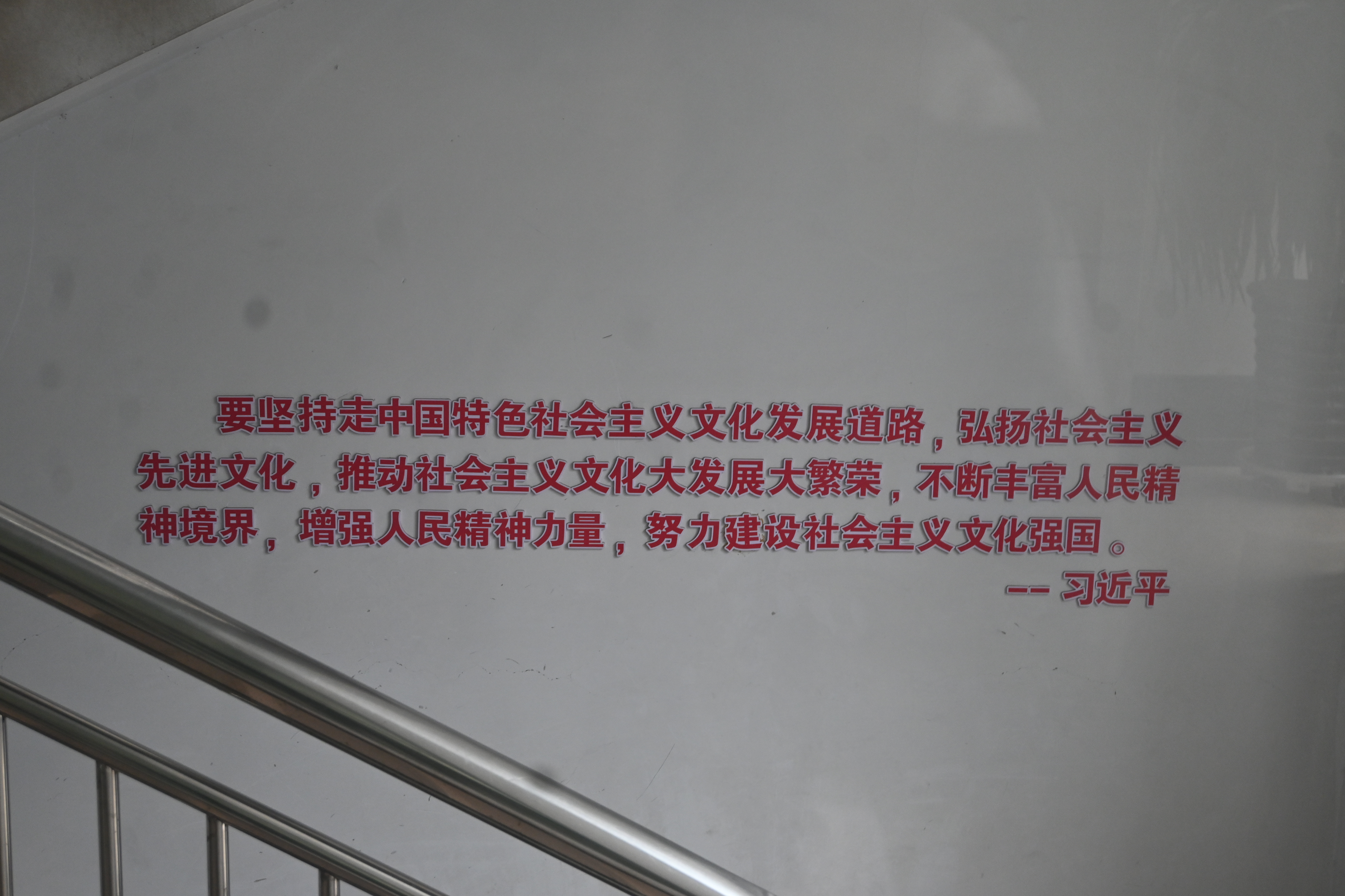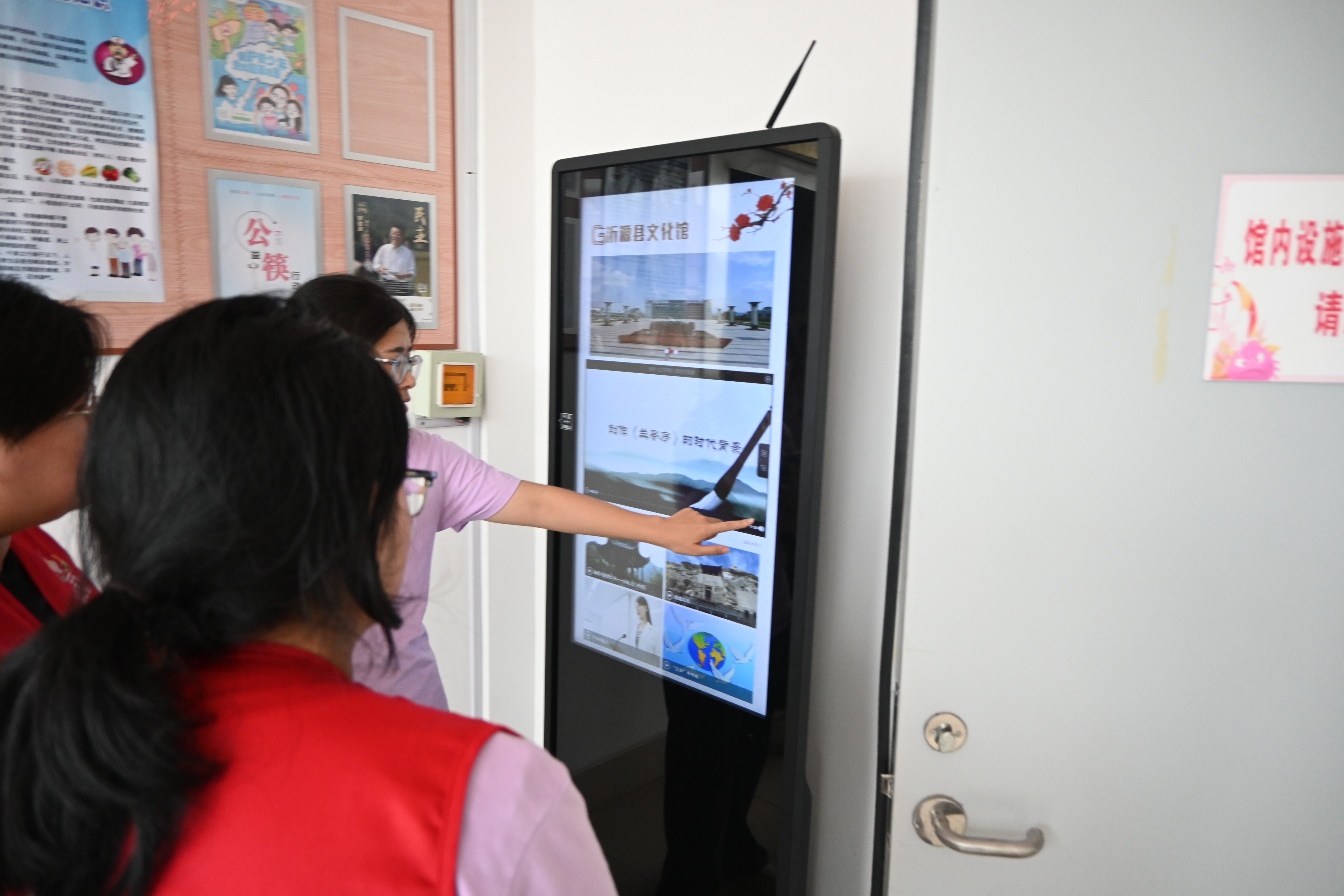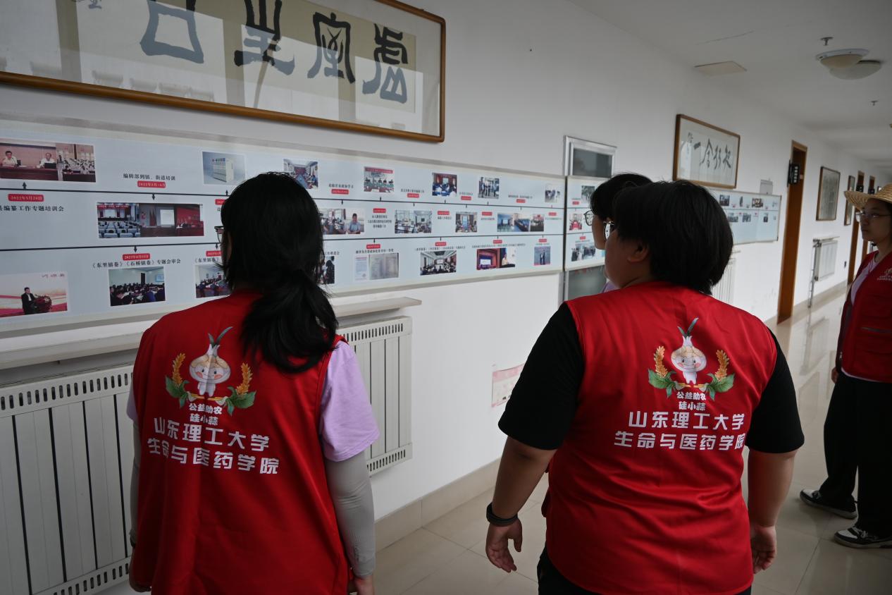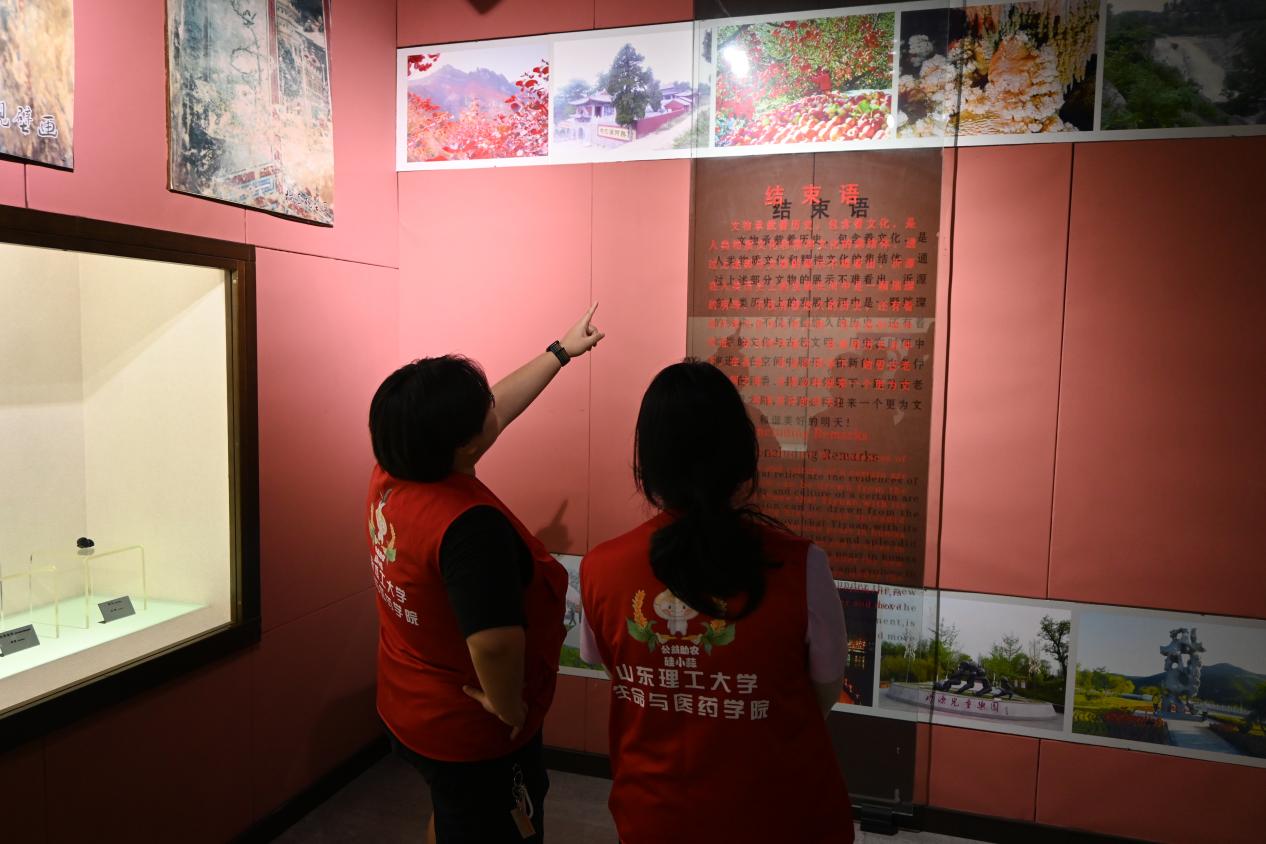 走进沂源县新时代文明实践中心,楼内建设层次分明,集县文旅局、县博物馆与县非遗文化中心等于一体,且随处可见有关文化建设的相关标语。据当地居民与有关工作人员介绍,成员们了解到,县博物馆与非遗文化中心的非遗文化长廊均为免费对外开放,且县博物馆已作为研学志愿对接地,与多个公司开展研学交流与志愿服务活动。