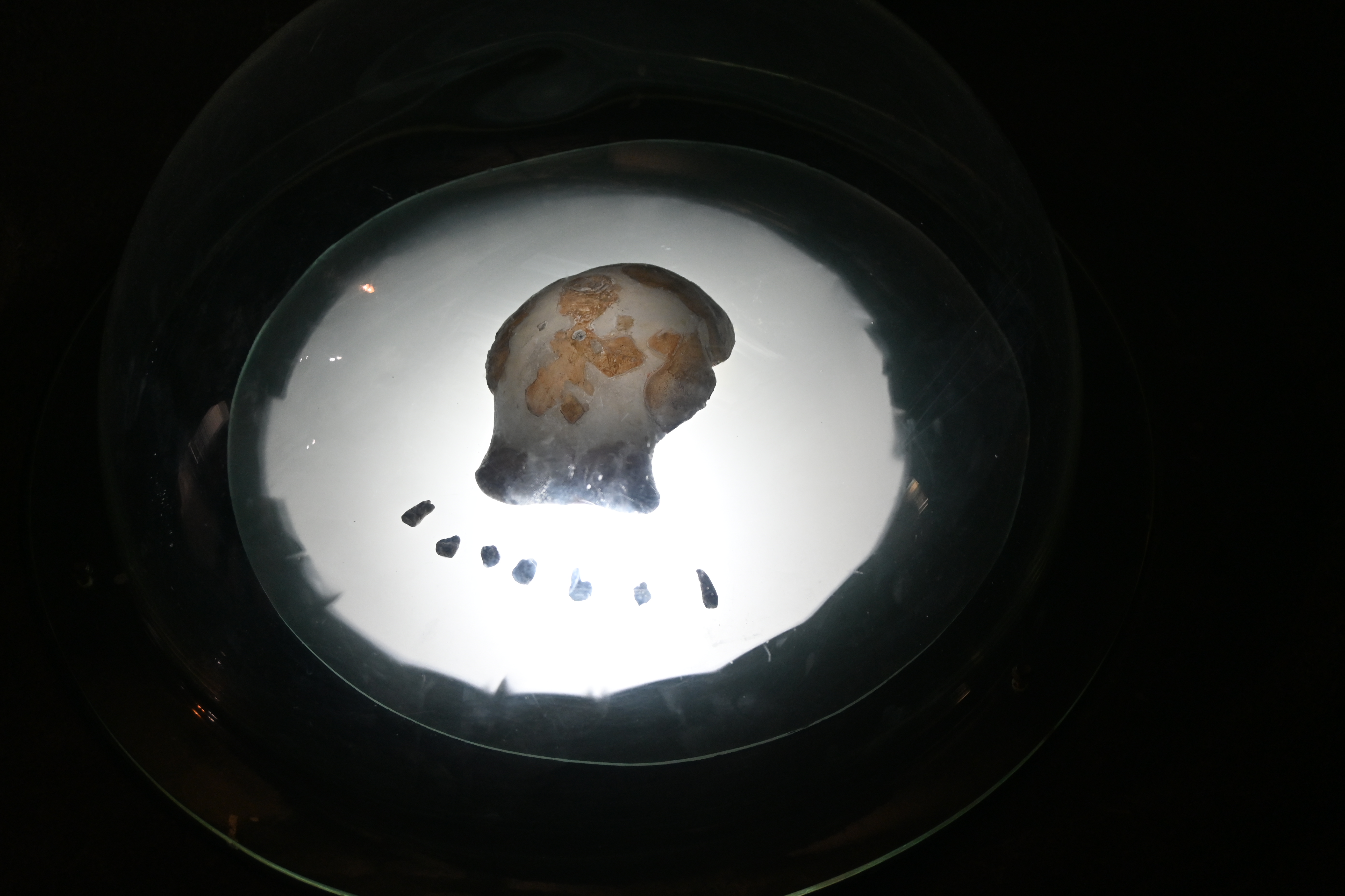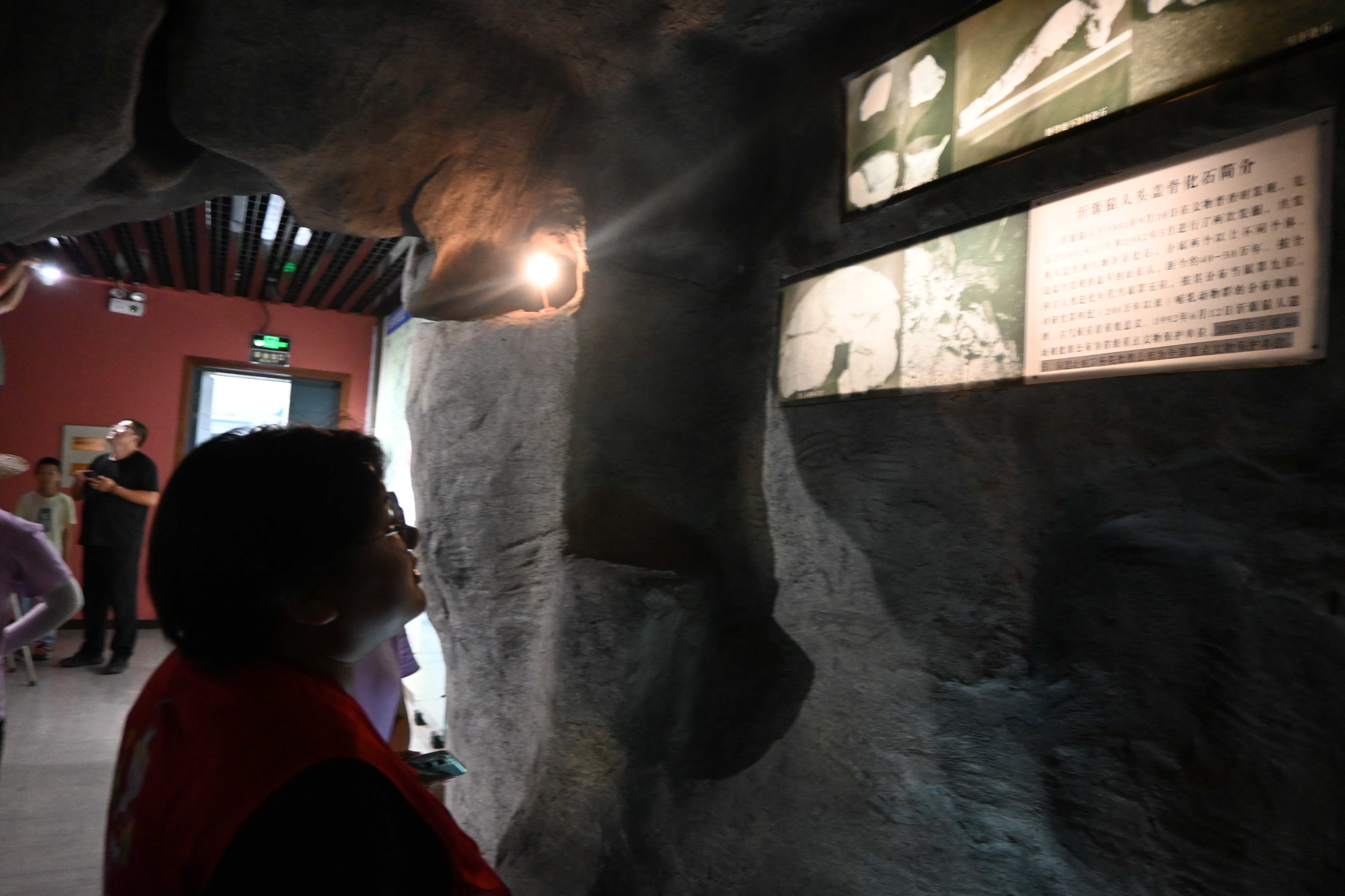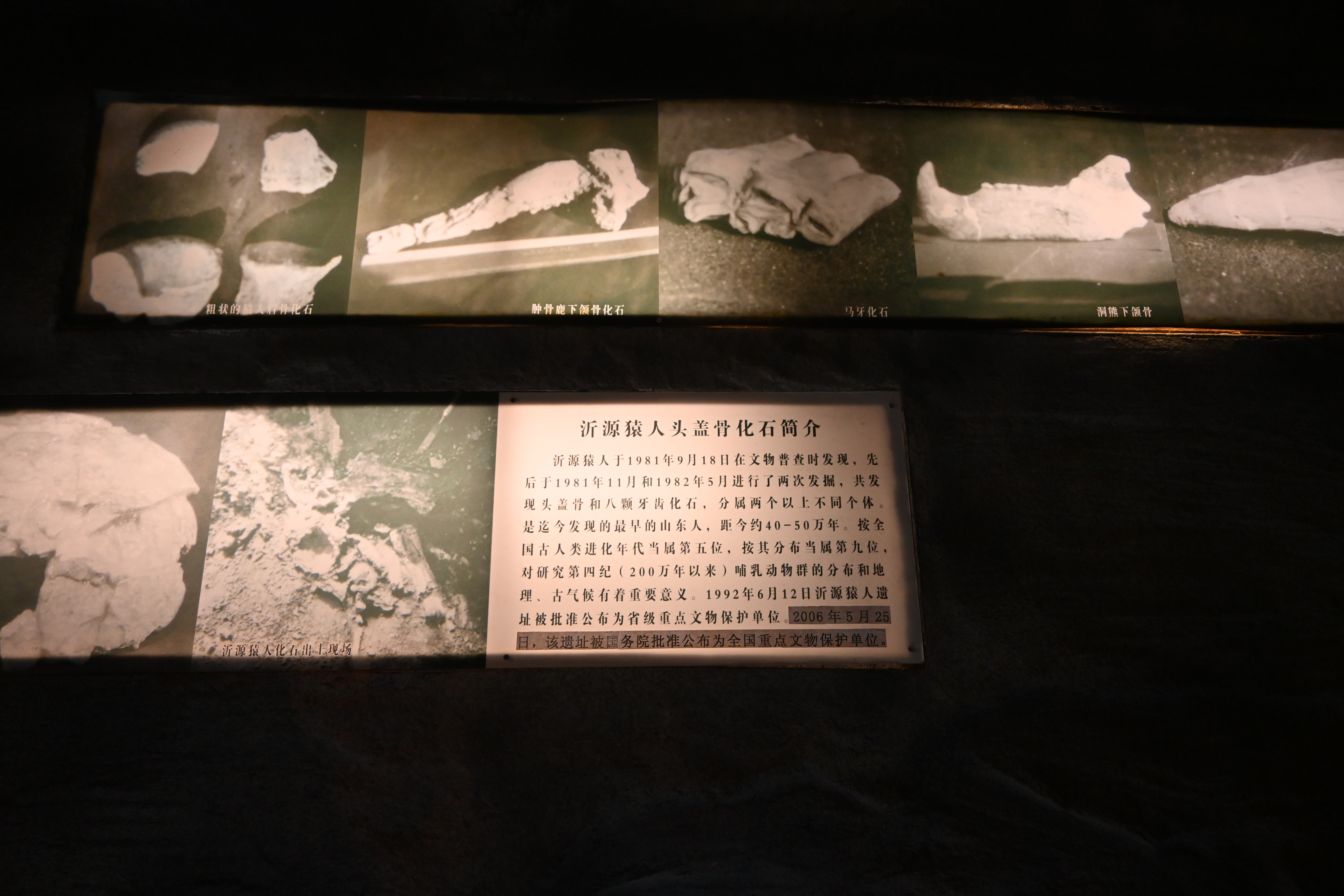 初临博物馆内,映入眼帘的即是入口处人为建造的仿古洞穴。通过讲解员讲解与相关牌示介绍,团队成员了解到,此处是通过仿古制洞穴,模拟还原古人类的居所,给参观者以沉浸式体验远古人类的居住生活。一侧展览柜所陈列的展出文物则是出土于沂源本地的古猿人头骨化石,足以证明沂源文明起源之历史悠久。
