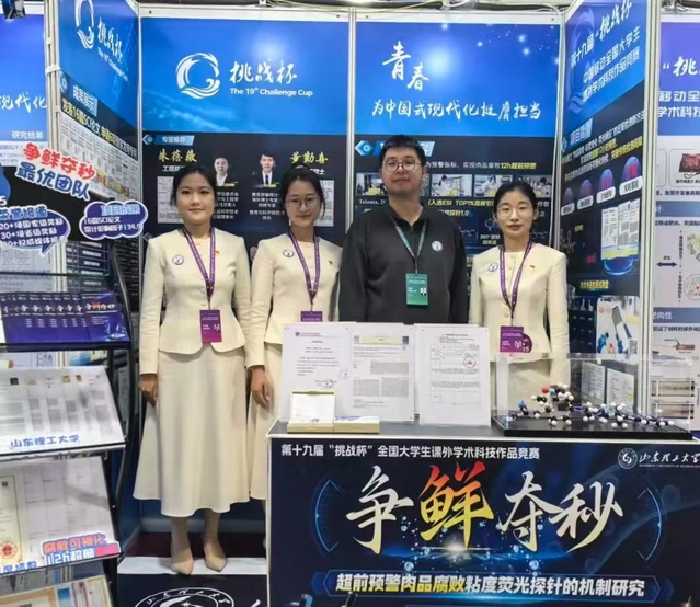 11月3日,第十九届“挑战杯”全国老员工课外学术科技作品竞赛(以下简称:“挑战杯”)在南京大学落幕,由公司舒伟等教师指导、制药2204(创新)姜青青同学等担任负责人的“争鲜夺秒——超前预警肉品腐败粘度荧光探针的机制研究”项目入围主体赛决赛,发挥出色,荣获特等奖。校团委书记王振带队赴现场观摩指导。