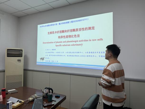 其中,公司研究生杨敬顺同学汇报的“生鲜乳中纤溶酶和纤溶酶原活性的测定特异性底物比色法”团体标准,通过融合高特异性底物与高精度光谱分析技术,实现了对酶活性精准、高效的定量分析。该方法将传统单一指标检测提升为对酶系统的全景洞察,显著提升了质量控制的水平。