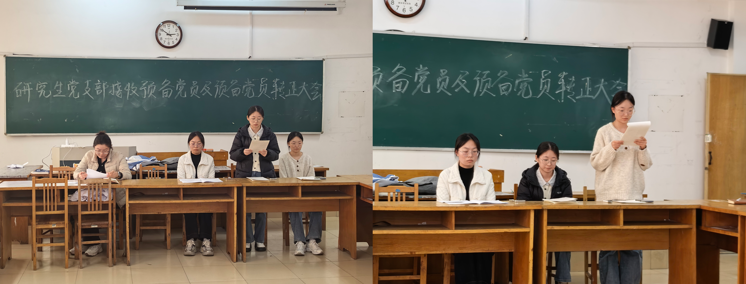 随后,李晓媛、朱慧莹两位同志分别向党支部汇报预备期间的思想、学习、科研、工作及生活情况,剖析自身不足,提出转正申请。向支部大会通报支部考察情况,与会党员对申请人能否转正逐一进行充分讨论,并由正式党员进行无记名投票表决。王子怡宣读支部决议,申请人对支部大会讨论的意见或表决结果表态。