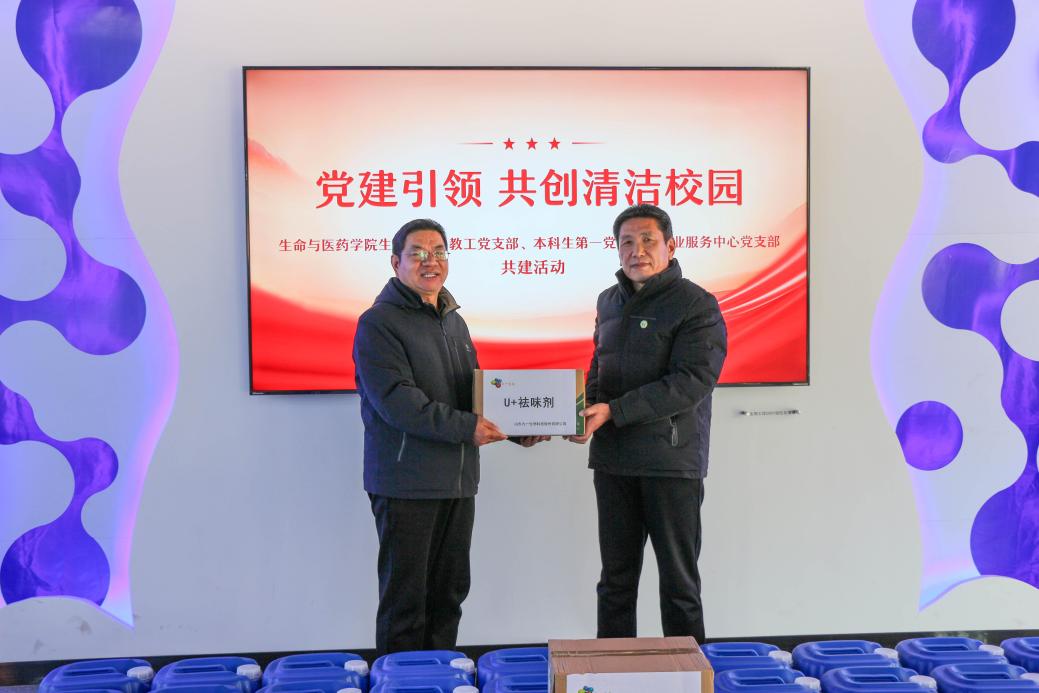 1月8日上午,“党建引领·共创清洁校园”支部共建活动暨“生物酶消毒祛味剂”捐赠仪式在13号教学楼270会议室举行。公司党委书记王光坊、学术副经理徐佳宁及后勤管理处副处长、物业服务中心党支部书记高名亮等人员参加活动。